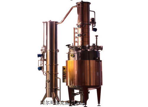 該設(shè)備是從液態(tài)醪中提取酒精的蒸餾器。也選用高純度紫銅板制作,采用燃?xì)饣蛘羝苯蛹訜徇B續(xù)、斷續(xù)投料方式蒸餾。其主要由蒸餾鍋、分餾塔、預(yù)熱器、冷凝器等