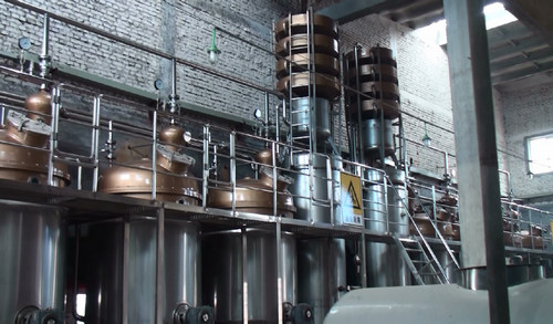 該蒸餾器是化工生產(chǎn)中分餾工藝的典型設(shè)備。在酒精生產(chǎn)中也已被廣泛使用。這種蒸餾設(shè)備可以蒸得純度很高的精餾酒精。但食用酒精的生產(chǎn)要求有所不同,為了形成特有的芳香和口味,在原酒蒸餾時(shí),不要求蒸得極高的純度,但必須把一些有芳香的物質(zhì)如高級(jí)醇類(lèi)、脂類(lèi)、芳香醛類(lèi)等提取出來(lái)。而塔式蒸餾器只適于提取酒精,而不利于提取醪液中的芳香物質(zhì)。因此用塔式蒸餾器蒸餾的原酒,酒質(zhì)和口感較差(如合理降低出酒塔節(jié),會(huì)有所改善)。不適合用于蒸餾高檔酒。該設(shè)備可進(jìn)行連續(xù)蒸餾,朗姆酒生產(chǎn)多有采用。